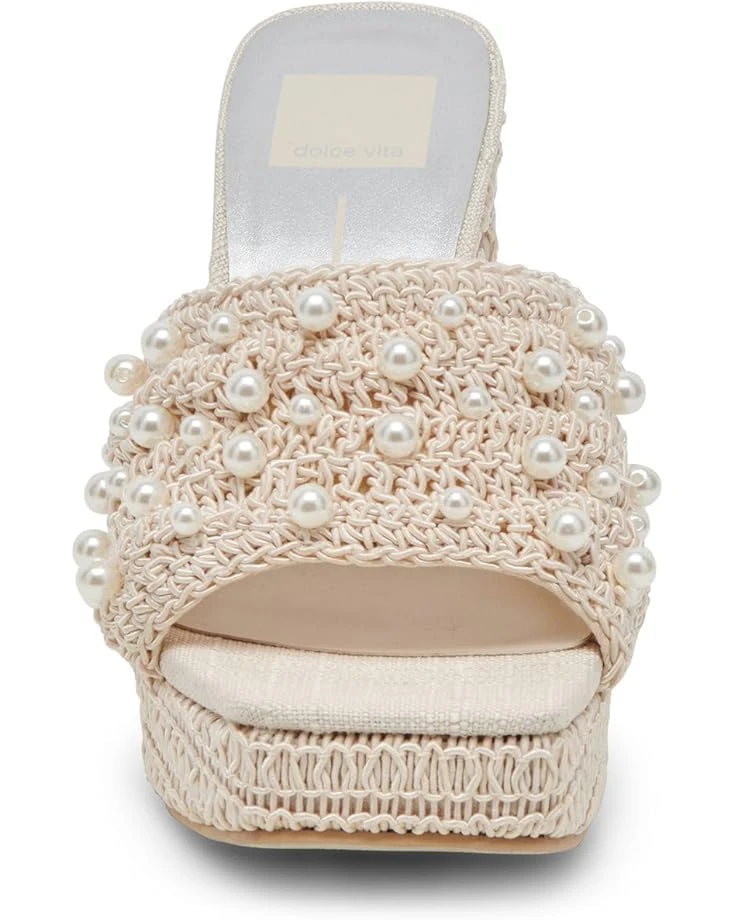 - A modern warm weather sandal with a striking twist! The Dolce Vitaยฎ Abeni Pearl-127 is prized for its woven knit upper embellished with sparkling faux pearls, recycled cotton twill lining, and DMFA-free synthetic footbed. Designed in an easy slip-on style, the shoes look sharp with the open square toe and lend some added height to your style with the lofty block heel and platform with woven detailing.