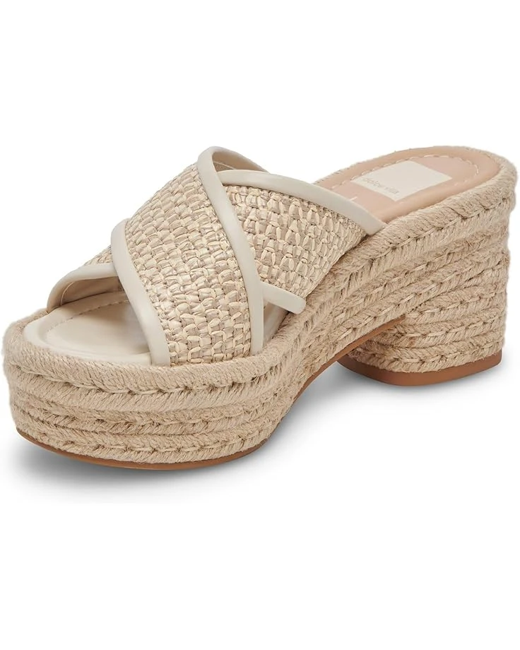- Channel your inner fashionista and embrace a trendsetting look during the warm weather season wearing the Dolce Vitaยฎ Eldora Platform Sandals. Framed with woven raffia synthetic upper straps in crossover design, these slip-on shoes are made comfortable with their breathable cotton lining and padded synthetic footbed. The raffia-wrapped espadrille platform and chunky block heel further elevate the style of this footwear.